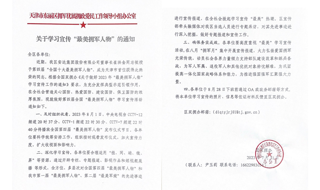 81日在建軍96周年之際及紀念延安雙擁運動80周年,央視法治頻道播出了《閃亮的名字-2023年最美擁軍人物發布儀式》,本次活動旨在深入學習貫徹習近平新時代中國特色社會主義思想和黨的二十大精神,深入貫徹落實習近平總書記關于雙擁工作重要論述,發揮先進典型示范引領作用,在全社會營造關心國防、熱愛國防、建設國防、保衛國防的濃厚氛圍,中共中央宣傳部、退役軍人事務部、中央軍委政治工作部、全國雙擁辦聯合發布最美擁軍人物先進事跡。安達集團黨委書記、董事長崔洪金獲得2023全國“最美擁軍人物”
